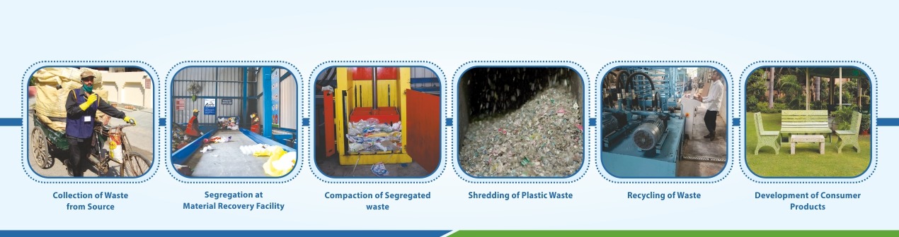 The recycling facility receives baled & compacted plastic waste (Multi-layered Plastic, LDPE and PP) from the material recovery facilities which is then shredded into smaller particles. The shredded particles are processed through Hot and Cold Press to make plastic boards of various thickness (6 mm to 24 mm) but uniform width and length (i.e. 8 feet x 4 feet), depending upon the requirement. These plastic waste recycled sheets are registered under the brand name 'Ecare'. These Ecare boards are being utilized in multiple applications like construction, developing playing equipment, school stationary products, gifting items, pallets in FMCG segment, planters, home decor items, office desk stationary, tree guards, dustbins, photo frames and many more. The quality & range of these products have been improved with more intensive R&D.
